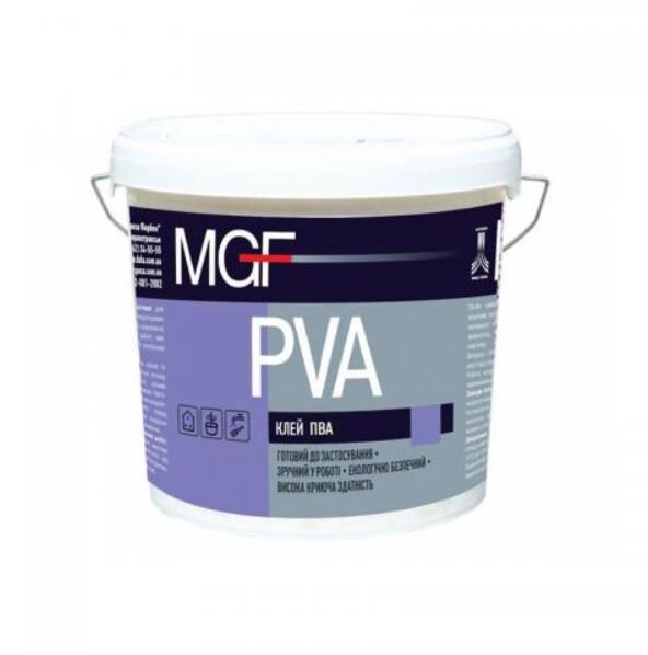 Клей ПВА MGF використовують для робіт в приміщенні. З його допомогою клеять шпалери, тканину, поролон, шкіру, картон, дерево, папір, керамічну плитку і гіпсокартон. Також його додають, як пластифікуючі домішка в бетон і цементні розчини. Він економічний в застосуванні, швидко висихає і повністю безпечний. Спочатку клей ПВА MGF білого кольору, але після того, як висохне, він стає прозорим. Наносити клей слід на вичищену, чисту і міцну поверхню. Глянцеві підстави які не вбирають клей, потрібно зашкурить, а потім очистити їх від пилу. Використовувати склеєні вироби можна лише через шість годин, а повну міцність шви знайдуть через добу.