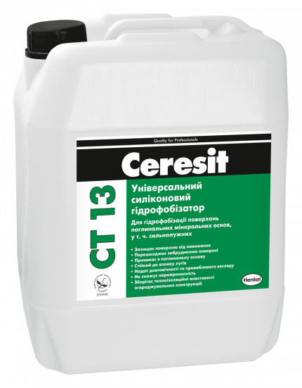 Універсальний силіконовий гідрофобізатор Ceresit CT 13 призначений для надання гідрофобних властивостей поверхням зі штучних і природних поглинальних матеріалів, у т. ч. сильнолужних (бетон та дрібноштучні вироби з нього, розчини на основі цементу, гіпсу і вапна, керамічна, силікатна та клінкерна цегла, штукатурка, мармур, піщаник та ін. мінеральні основи). Забезпечує водозахисні властивості мінеральних основ, вкритих мікротріщинами шириною до 0,2 мм. Використовується зовні та всередині приміщень.