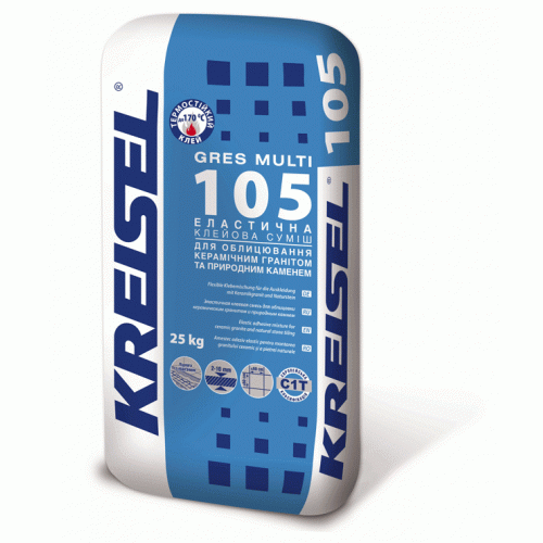 Клей для приклеювання керамограніта Kreisel 105 gres multi у вигляді сухої суміші в’язких матеріалів, мінеральних наповнювачів і модифікуючих добавок. Після змішування з водою утворює однорідну клейову масу, призначену для нанесення тонким шаром. Після затвердіння морозо- і водостійкий. Відрізняється високою еластичністю і адгезією.